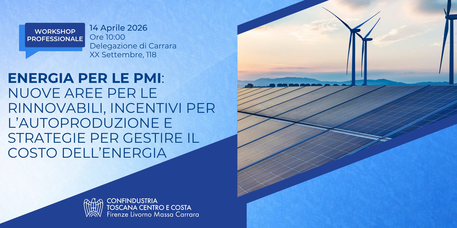 Nell’ambito dell’incontro promosso dalla sezione Ecologia e Ambiente di Confindustria Toscana Centro e Costa, verranno approfondiremo i vincoli normativi sulle aree idonee per l’installazione di impianti di autoproduzione, gli incentivi disponibili e le soluzioni più efficaci.