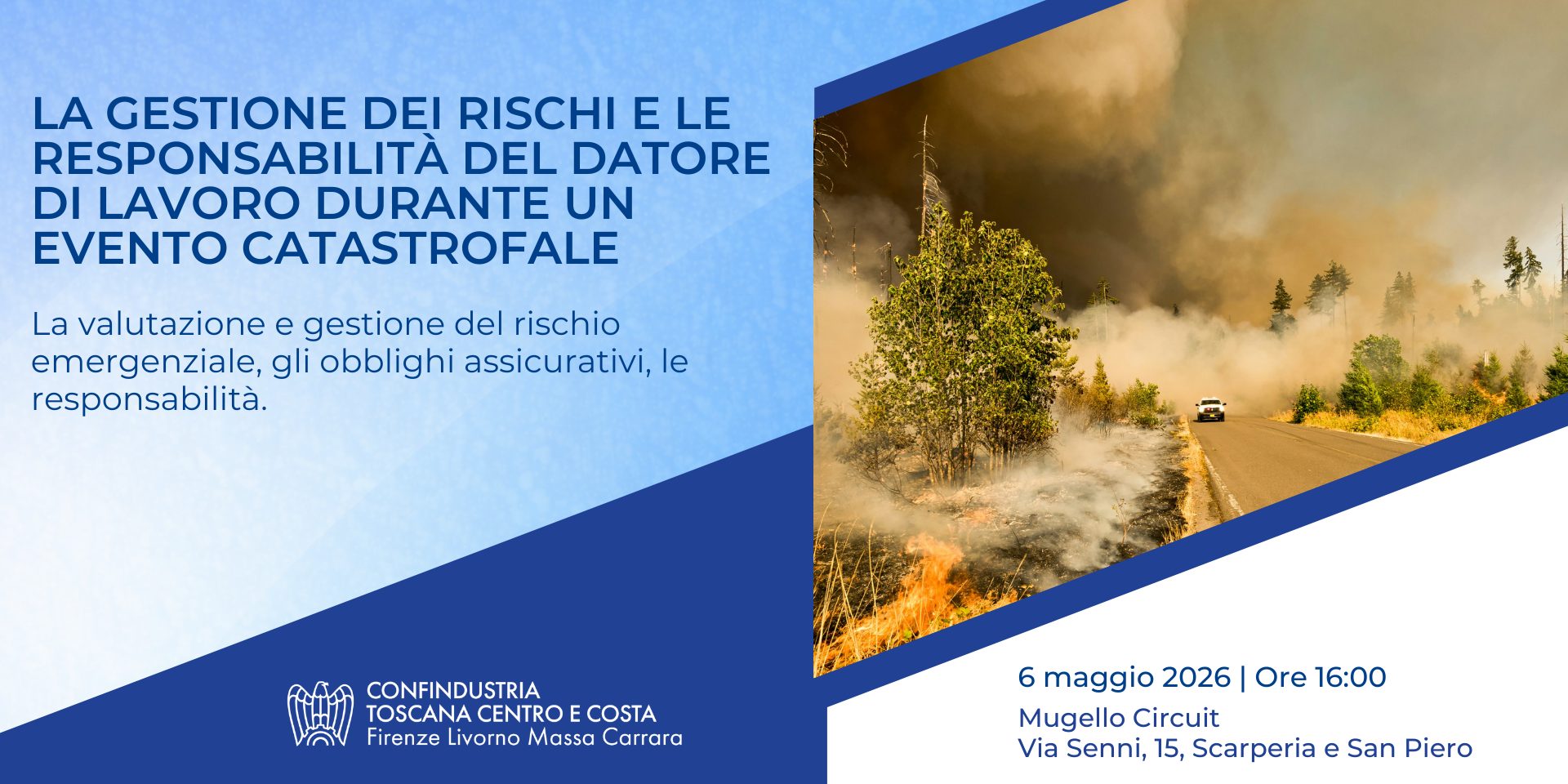 I continui e imprevedibili eventi legati ai cambiamenti climatici impongono al Datore di lavoro di adottare una puntuale valutazione di tutti i possibili rischi di natura ambientale che possono coinvolgere i propri collaboratori, inoltre la legge 231/2023 introduce l’obbligo assicurativo contro i rischi catastrofali (terremoti, alluvioni, frane, inondazioni ed esondazioni), per i terreni, fabbricati, impianti e macchinari, attrezzature industriali e commerciali. Il Presidio territoriale Mugello Valdisieve di Confindustria Toscana Centro e Costa ha organizzato un approfondimento degli obblighi normativi, delle modalità operative e delle opportunità offerte dalle nuove disposizioni, con particolare attenzione agli aspetti pratici, alle implicazioni economiche e alle responsabilità del Datore di lavoro.
