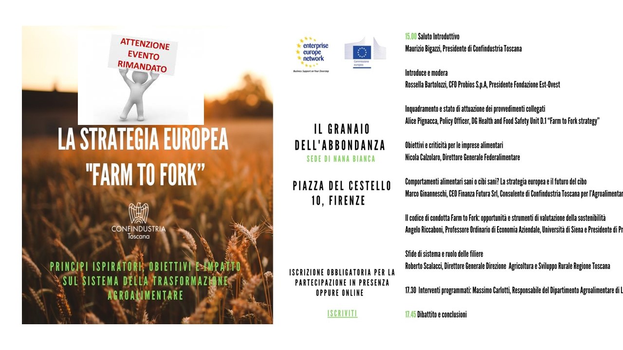 Con la finalità di informare e preparare le imprese ai cambiamenti orami prossimi, Confindustria Toscana ha organizzato un Seminario speciale: La strategia europea Farm to Fork. Principi ispiratori, obiettivi e impatto sulla trasformazione agroalimentare: 23 novembre 2021, dalle ore 15, presso Nana Bianca Piazza del Cestello 10 e online.
