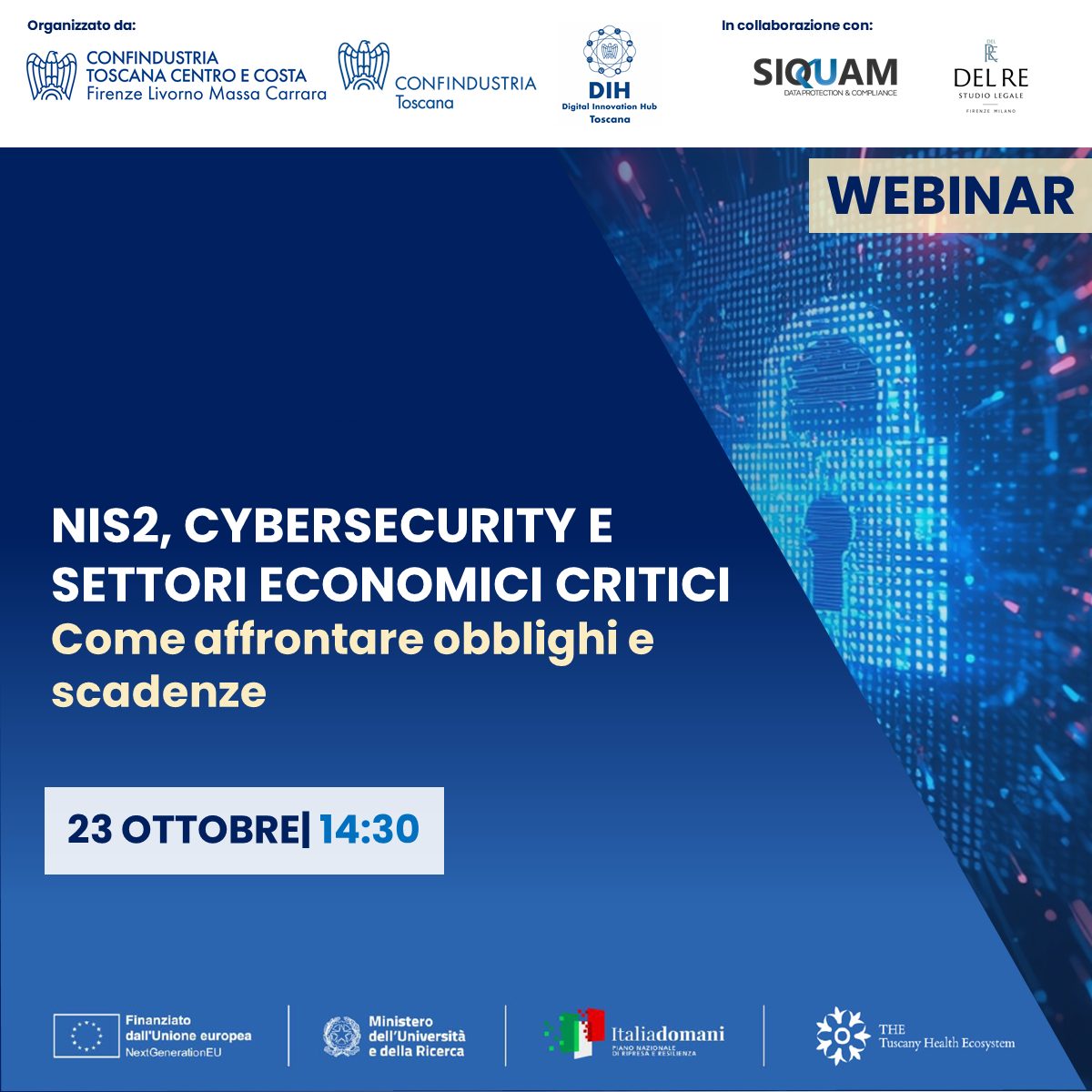 Organizzato da Digital Innovation Hub Toscana, Confindustria Toscana Centro e Costa e Confindustria Toscana, l’incontro contribuirà a informare sulle nuove responsabilità e sulle azioni necessarie per l’adeguamento normativo.
